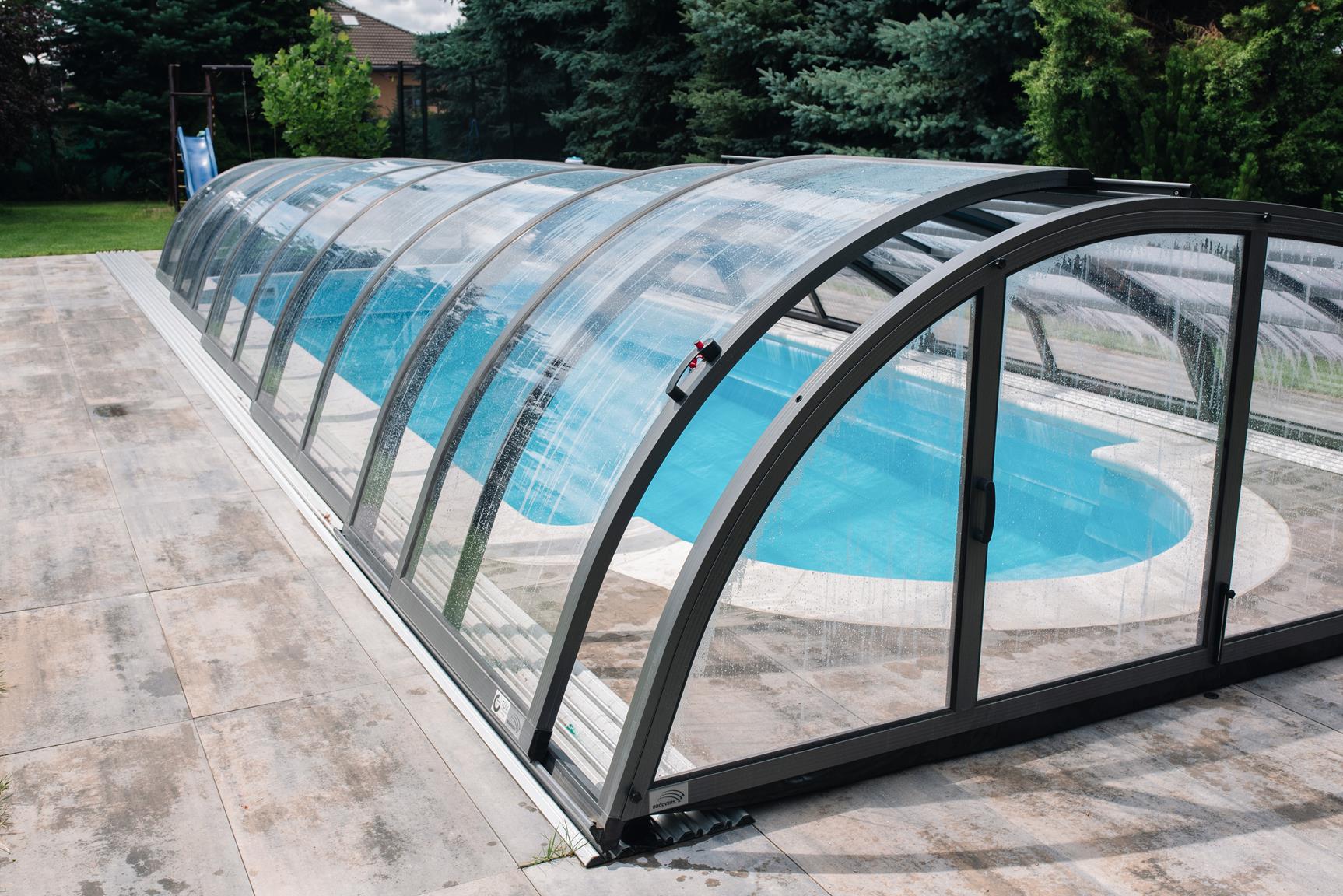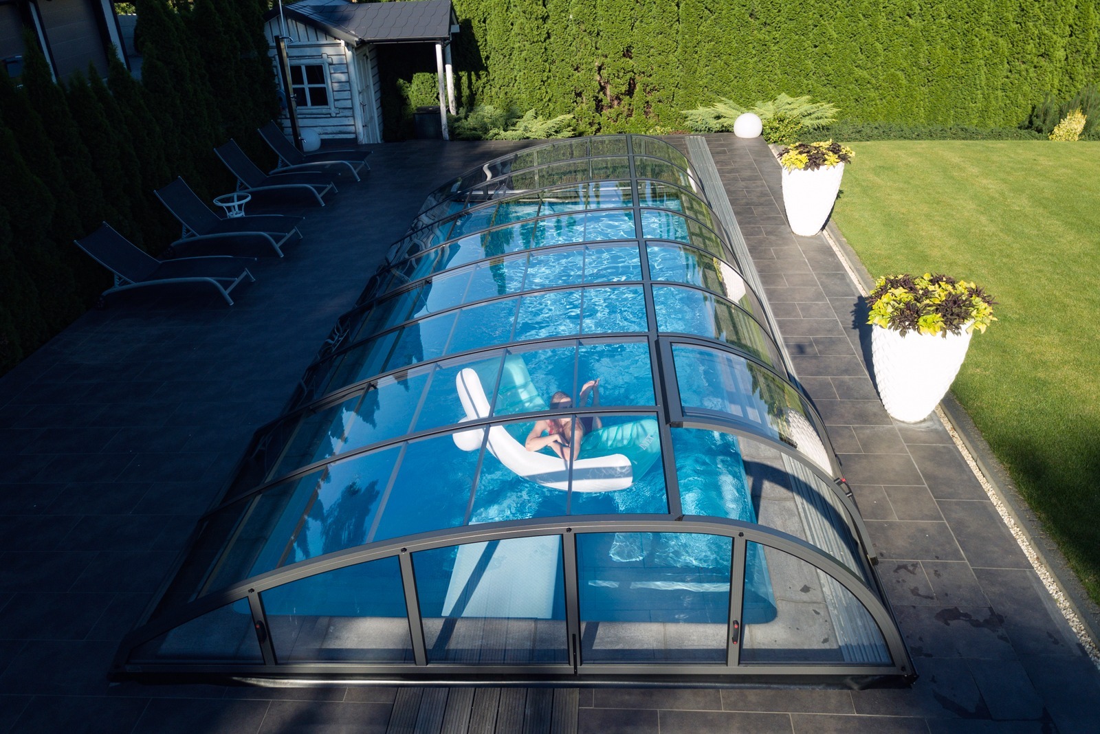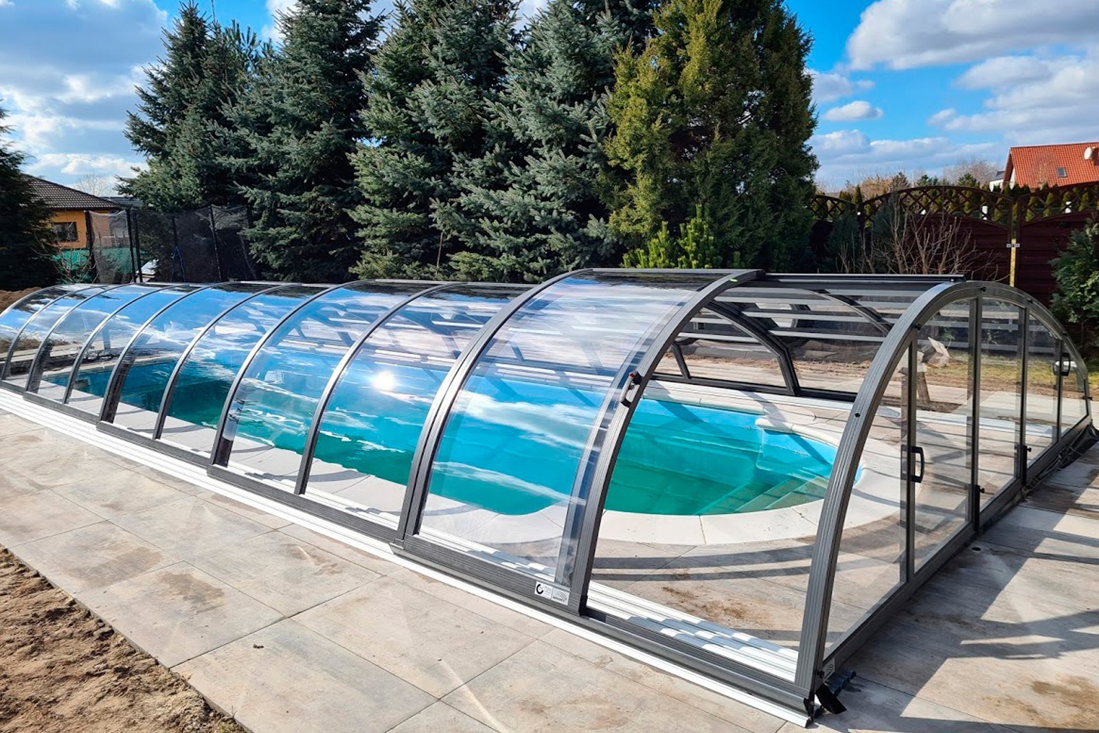 Poolüberdachung WAVE Das Modell der Poolüberdachung WAVE zeichnet sich durch eine außergewöhnliche Form aus, die scharfe Linien mit sanften Kurven und einer asymmetrischen Erhöhung auf einer Seite kombiniert. Entworfen nach den neuesten Trends. Sein elegantes Design verleiht jedem Garten nicht nur Attraktivität, sondern auch Glanz. WAVE ist die ideale Wahl für alle, die Funktionalität mit modernem Aussehen verbinden möchten.