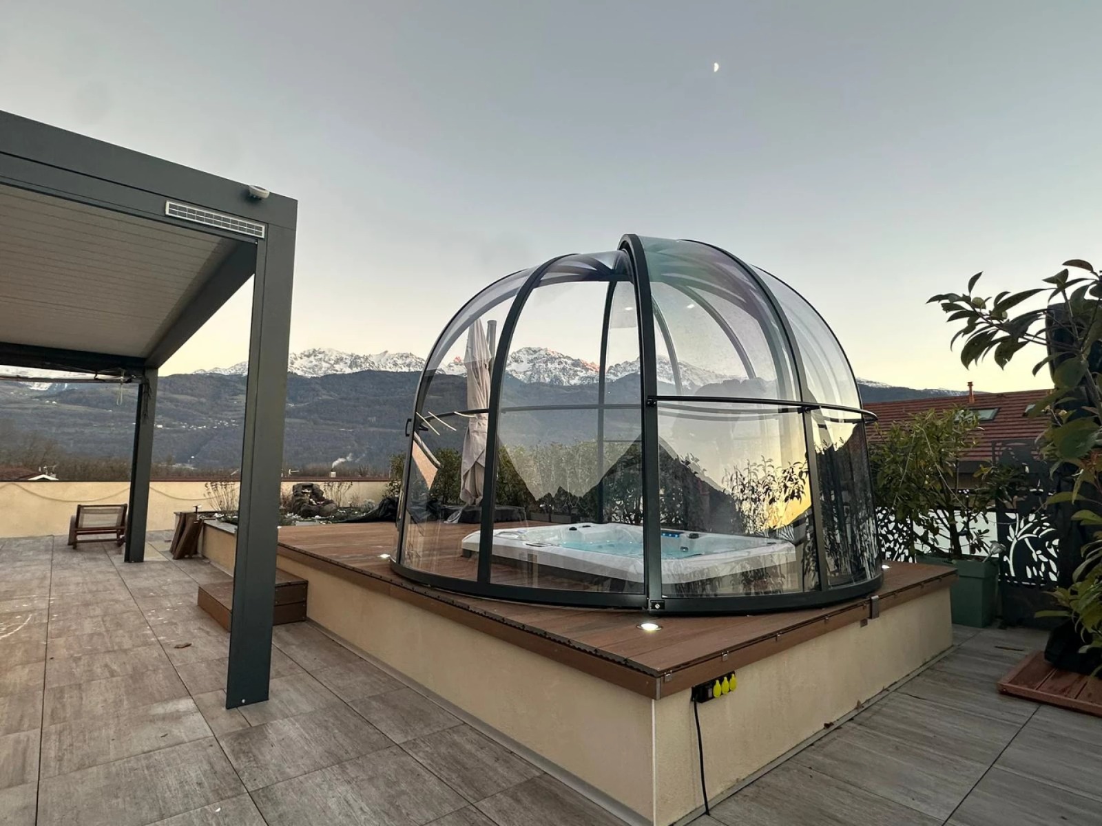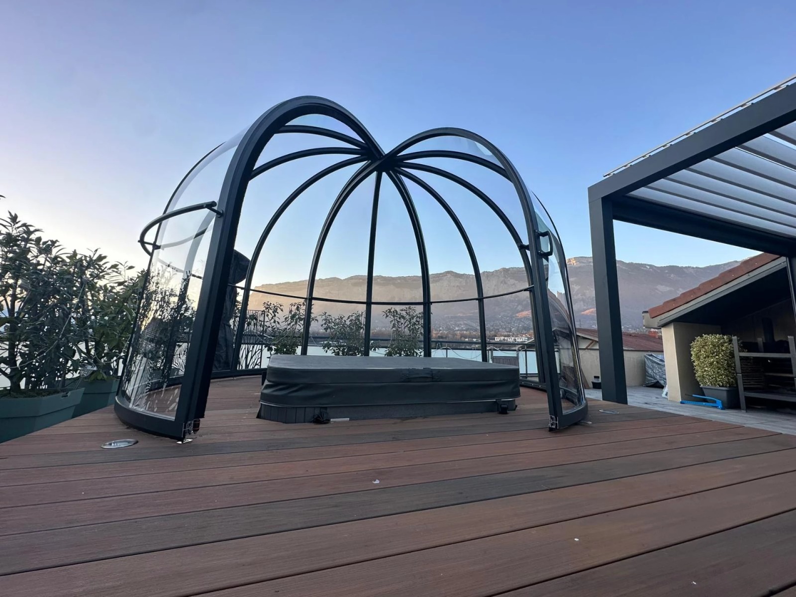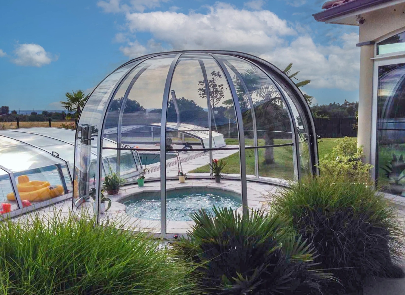 Unser kuppelförmiges Modell, erhältlich in zwei Größen, wurde speziell für die Abdeckung von Outdoor-Whirlpools entwickelt, damit diese unabhängig vom Wetter genutzt werden können. Der Raum unter der Konstruktion schafft einen Rundgang um den Whirlpool. Die Abdeckung lässt sich einfach und fließend öffnen – sie kann zu einer Halbkugel zusammengefaltet werden, was einen bequemen Zugang zum Whirlpool ermöglicht.